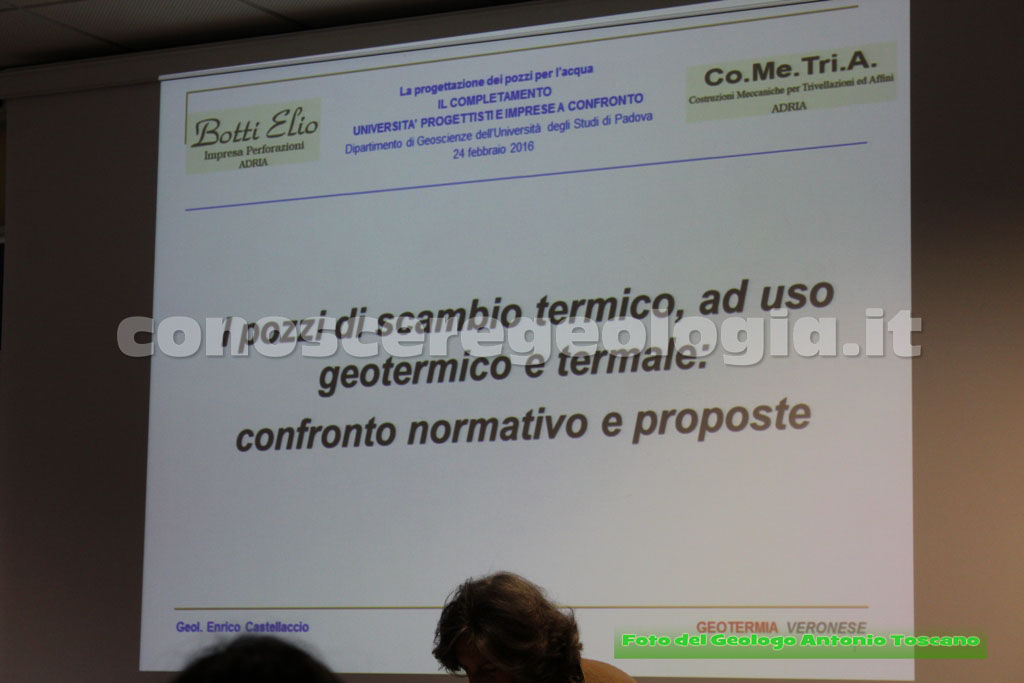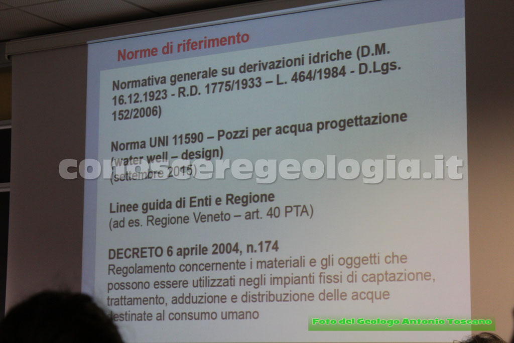 Ad iniziare le relazioni tecniche è stato il Dr. Pietro Zangheri, docente di Legislazione sull’utilizzo delle georisorse e la tutela dell’ambiente dell’Università di Padova, che ha presentato un intervento sulla normativa che regola la progettazione e i materiali da costruzione dei pozzi.