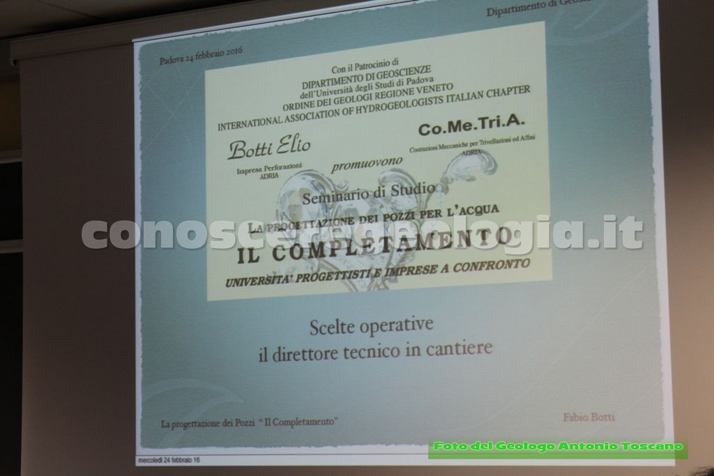 L’evento è iniziato con i saluti del Direttore del Dipartimento di Geoscienze dell’Università di Padova, la Prof.ssa Cristina Stefani, di Paolo Fabbri, rappresentante di IAH I, di Giorgio Botti per BOTTI ELIO e del Vice-Presidente dell’Ordine dei Geologi del Veneto, Nicola De Zorzi.