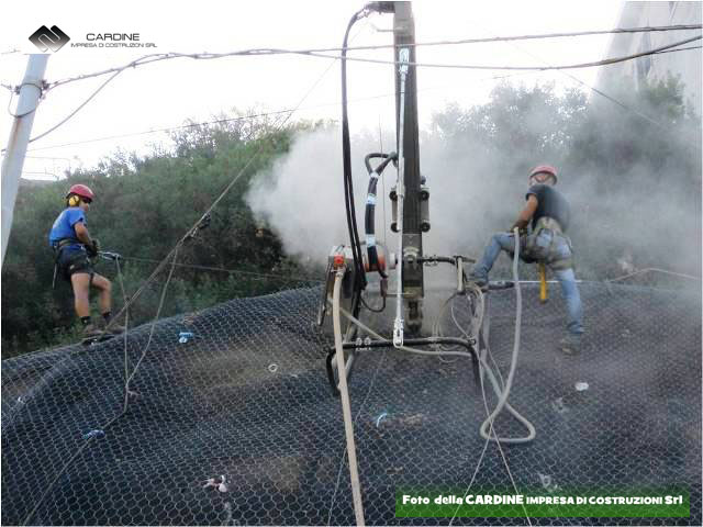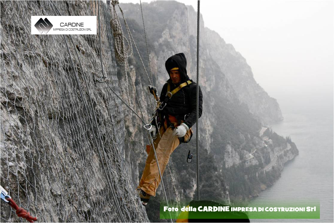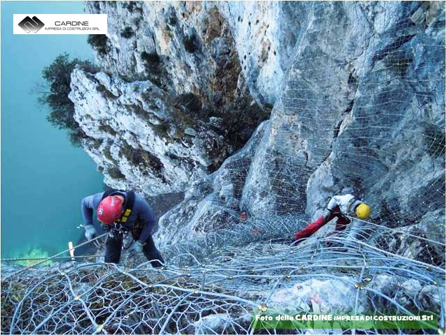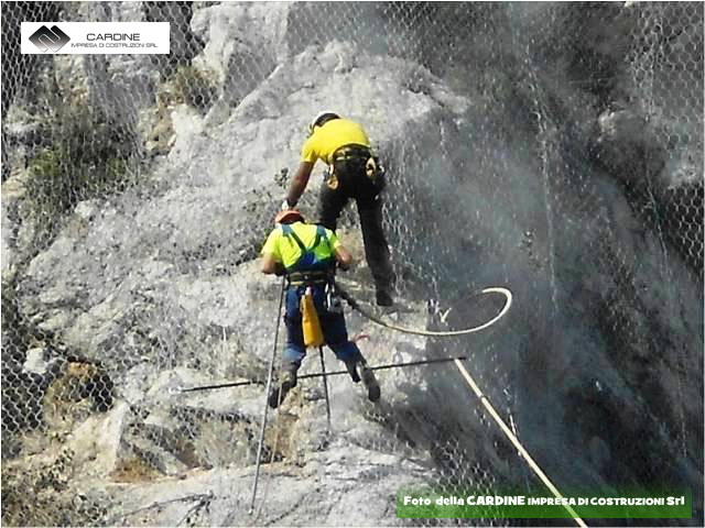 A protezione di cadute di massi e terriccio dal fronte della parete rocciosa, si utilizza la posa in opera di una rete di acciaio zincato a maglie strette, rinforzata da cavi di acciaio zincato disposti a losanga e relativa chiodatura di fissaggio con estremità filettate, chiuse da piastre e bulloni (vedi foto 6 della Cardine srl).