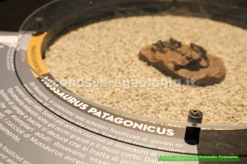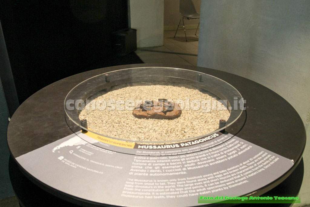 Alla fine della galleria introduttiva si entra nella prima sala espositiva, quella del Triassico, dove è mostrato uno dei più antichi dinosauri ritrovato in Patagonia, dal nome Mussaurus (Lucertola Topo), vissuto 220 milioni di anni fa. Il nome deriva dal fatto che quando fu scoperto si pensava fosse un dinosauro simile a un topo. In seguito si capì che era un cucciolo di dinosauro, con la tipica testa e cavità orbitali grandi (Vedi foto 6 e 7).