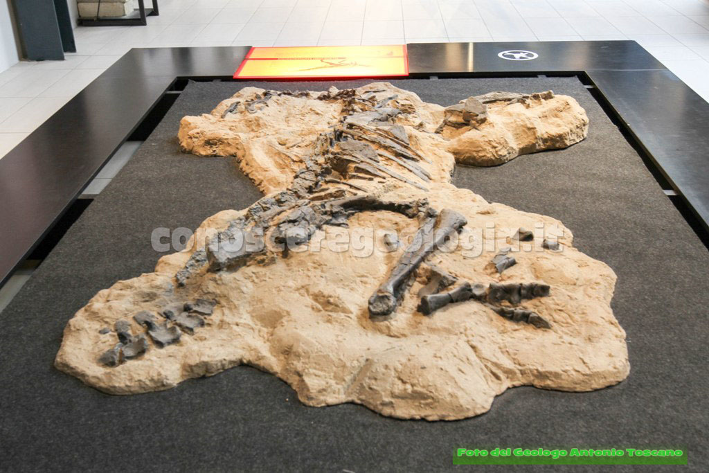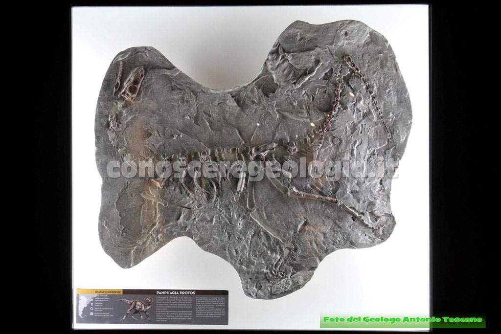 In fondo alla stanza del Triassico è esposto un reperto di dinosauro che ci dà l’idea di come si trovano i fossili e i dinosauri, cioè all’interno dei sedimenti di roccia (Vedi foto 16). Quello esposto è un dinosauro onnivoro dal nome Panfagia Protos, che si nutriva di felci e di insetti e che rappresenta un collegamento tra i primitivi carnivori e i dinosauri erbivori.