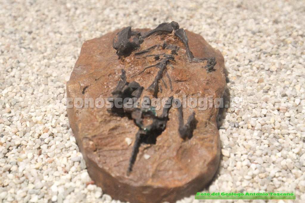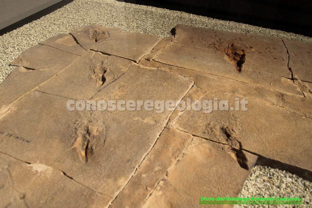 Di seguito sono esposte delle tracce di impronte fossilizzate, forse di un bipede carnivoro (Vedi foto 19). Le impronte fossilizzate danno informazioni diverse rispetto agli scheletri. In genere possono essere impronte di movimento ma possono essere anche di uova o coproliti (escrementi).