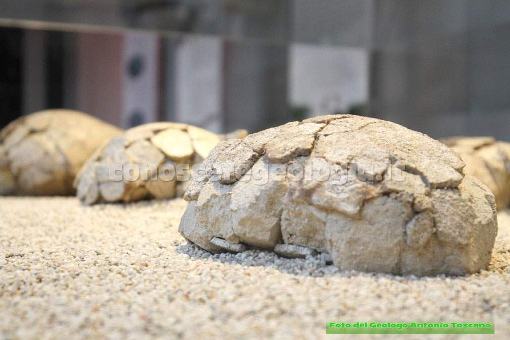 Infine in mostra sono esposte sei uova di sauropodi (vedi foto 29) trovate nello straordinario sito di Auca Mahuevo, nella provincia di Neuquén in Patagonia. In questo sito, in un avvallamento di 1 kmq, sono state trovate uova a gruppi di 20/30 distanti di 2 o 3 metri. Da ciò si è capito che le femmine andavano a deporre le uova insieme. La cosa interessante di questo sito è che sono state trovate uova in più livelli di strati di roccia, il che significa che le femmine sono tornate, nei millenni, a depositare le uova sempre nello stesso posto.
