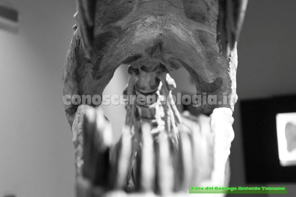 E’ chiamato titanosauro; come si vede la testa è molto piccola rispetto al corpo e i denti sono tutti uguali e posti solo davati (Vedi foto 26). Da qui di capisce che questi animali non masticavano, avevano quindi dei gastroliti (piccoli  sassi) nello stomaco per aiutare la digestione.