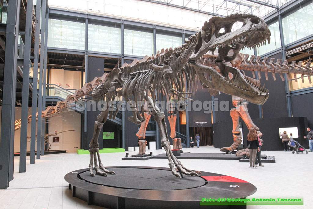 Il predatore esposto era molto più grande del più famoso Tirannosaurus Rex, vissuto a nord della Terra. Presentava zampe posteriori molto sviluppate e anteriori molto ridotte. Erano dinosauri che per correre hanno dovuto sviluppare i polmoni e i muscoli, per questo motivo ridussero di molto le zampe anteriori.