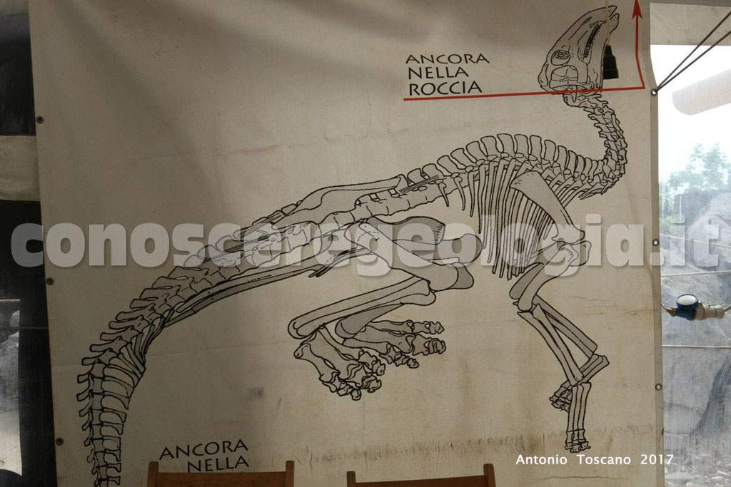 Ci sono voluti sei mesi di lavoro sul terreno e 3500 ore di preparazione in laboratorio per estrarre il più grande e completo dinosauro italiano ed europeo. E’ stato necessario ricorrere a metodologie particolari per estrarre i fossili dalla roccia, sia in fase di scavo che nei successivi interventi di preparazione. La giacitura verticale degli strati e la morfologia del terreno di fatto impedivano gli approcci tradizionali. In maniera del tutto innovativa, valutati i rischi ed i vantaggi, si è effettuato un taglio orizzontale della lente fossilifera, ad una profondità media di due metri dalla superficie.