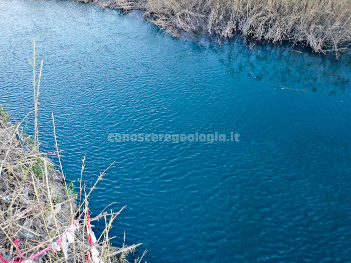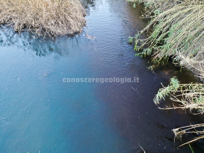 - L’immissione dell’Alveo Comune (a destra) nel Sarno (a sinistra). Notare la diversa colorazione delle acque