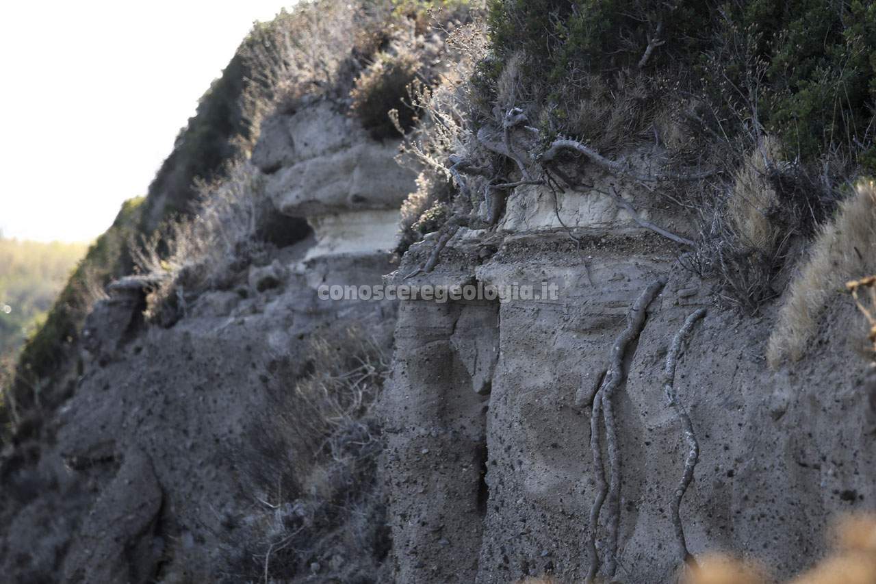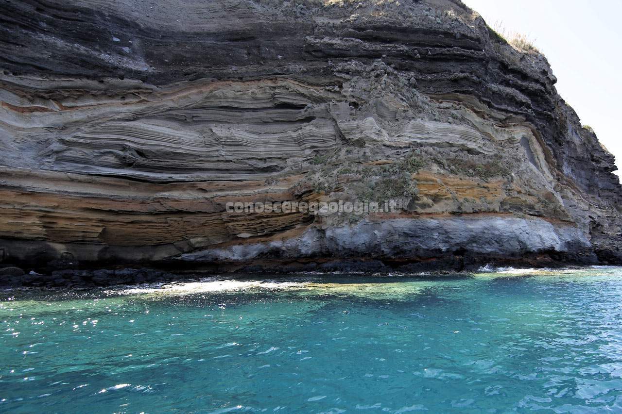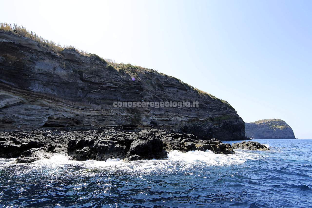 Sull’isola di Ventotene queste condizioni di sovrapposizione e interstratificazione tra i due gruppi di rocce vulcaniche è frequentemente presente.