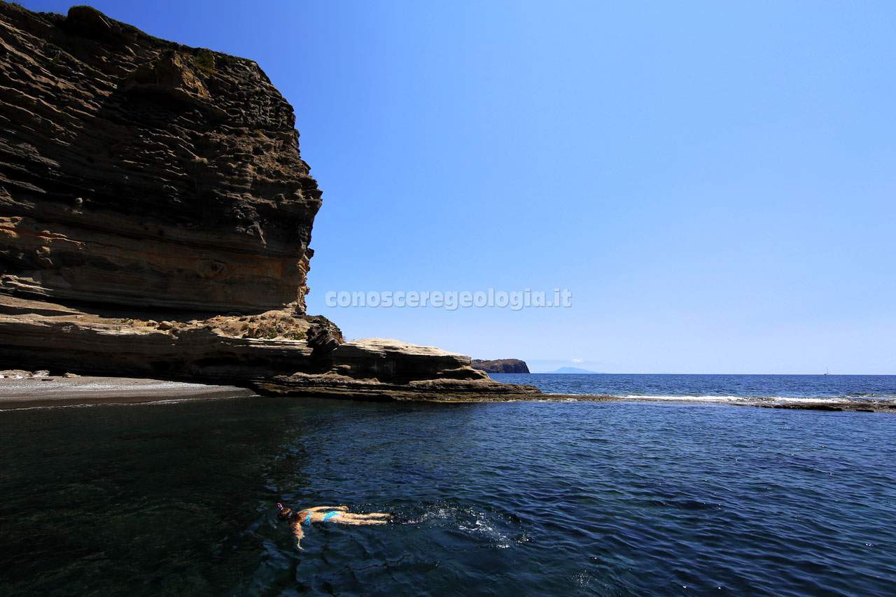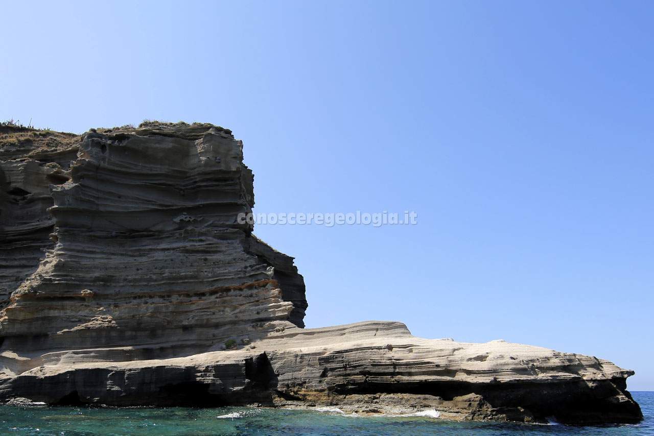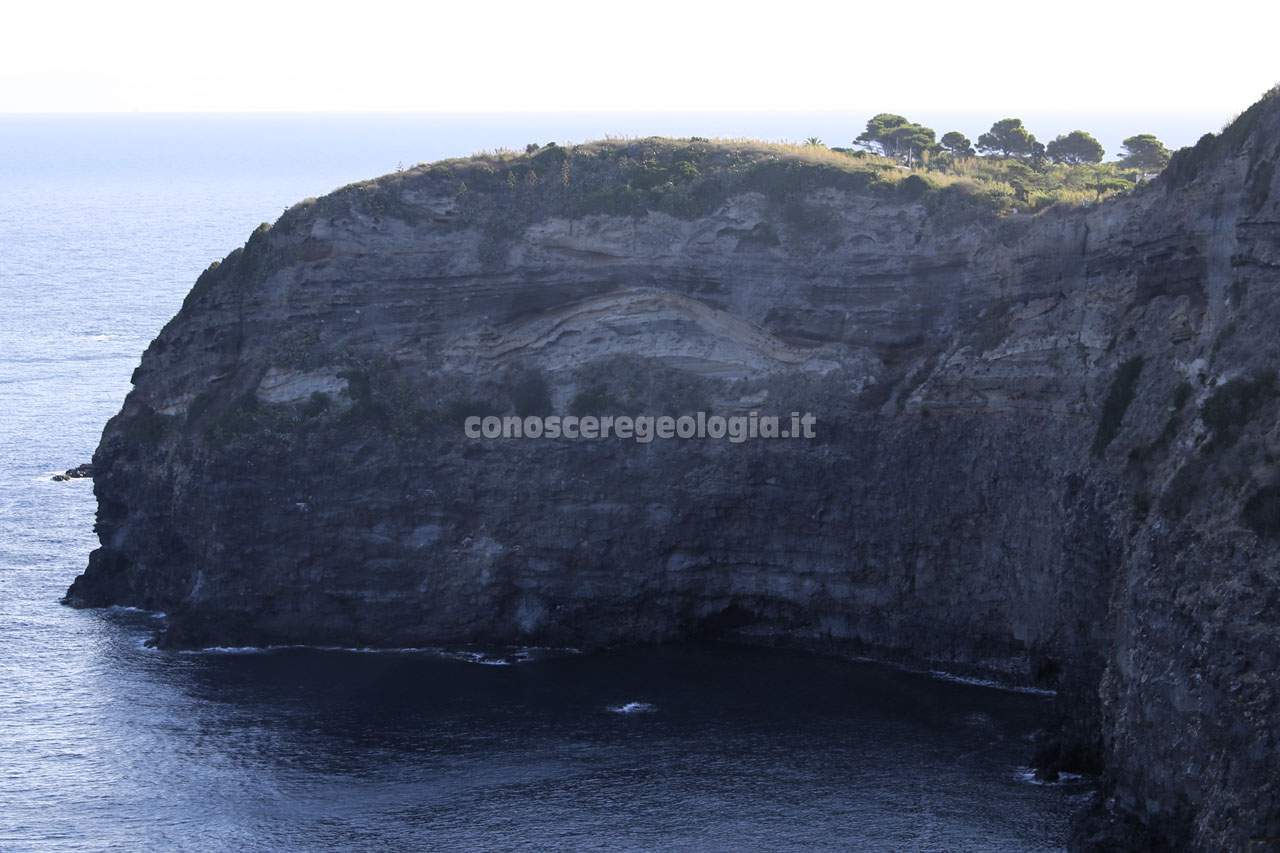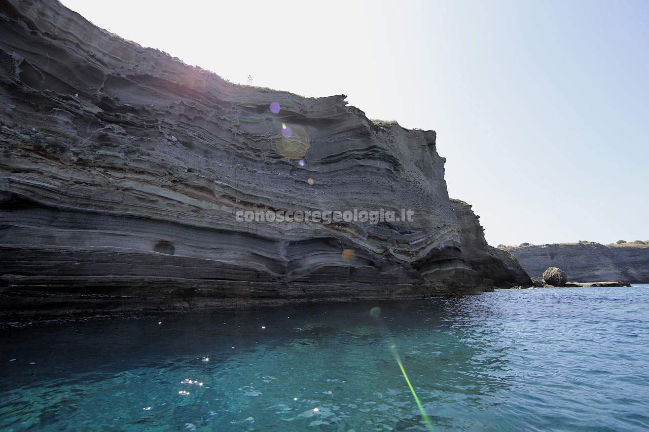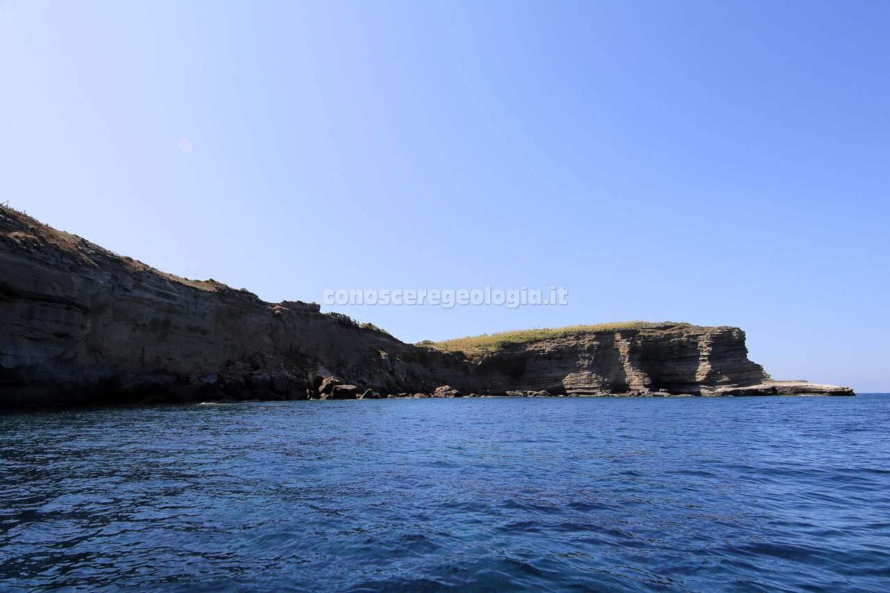L’isola di Ventotene è caratterizzata dalla presenza di spettacolari falesie, cioè di versanti sub-verticali originati dall’erosione marina dei depositi vulcanici, che presentano un’immersione (cioè una pendenza degli strati) verso est-nord-est.