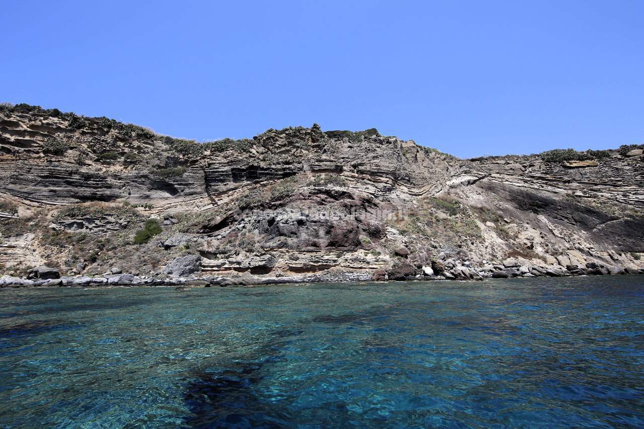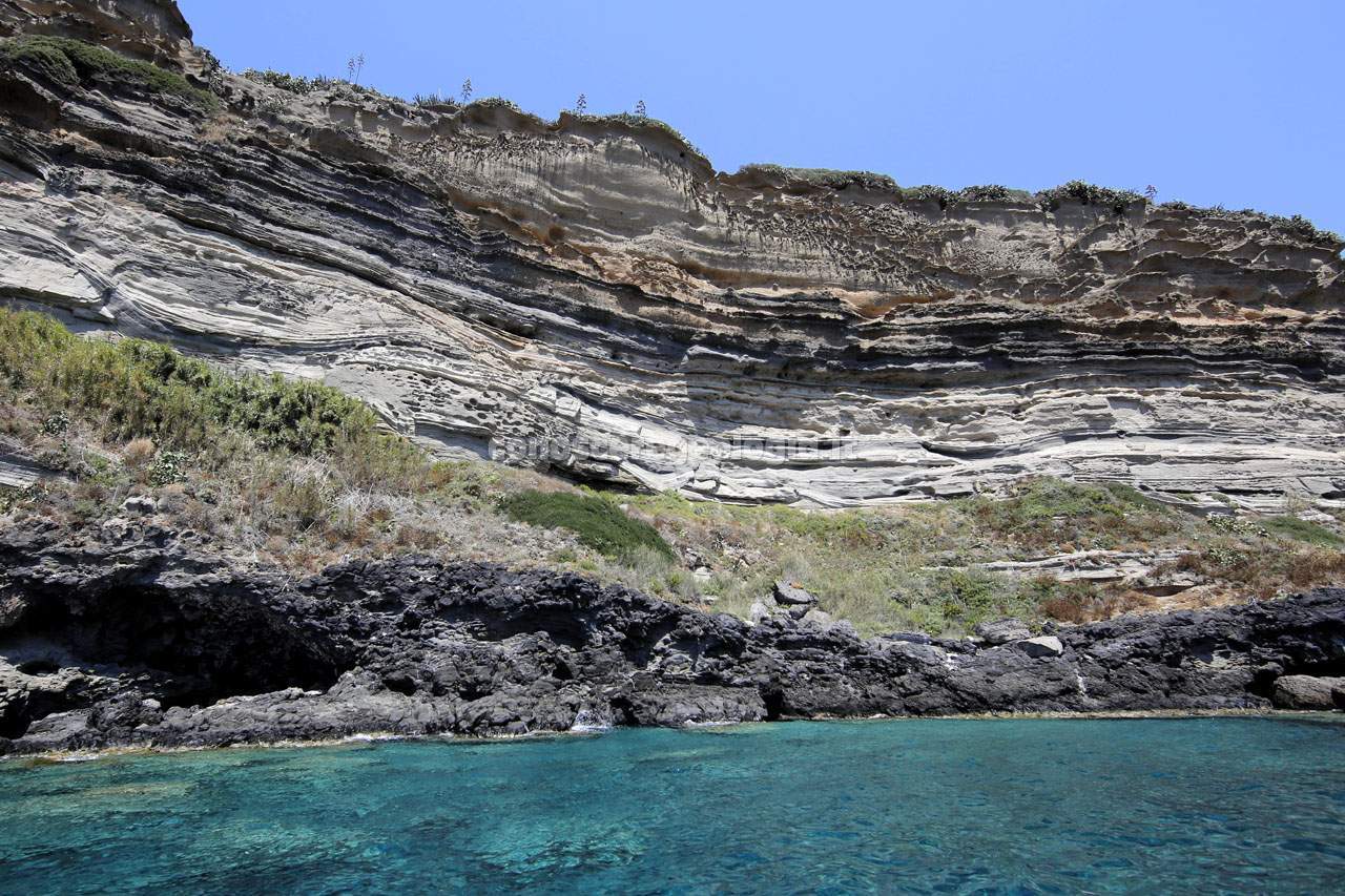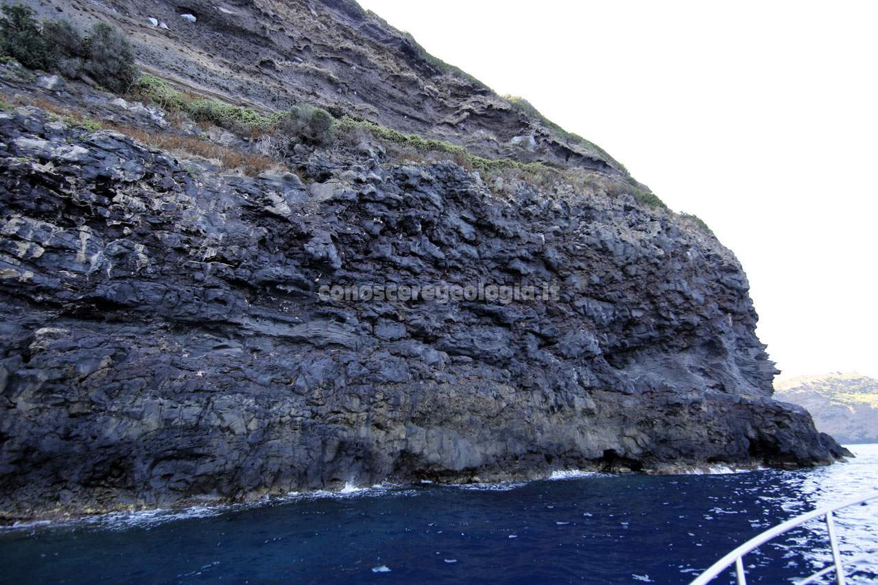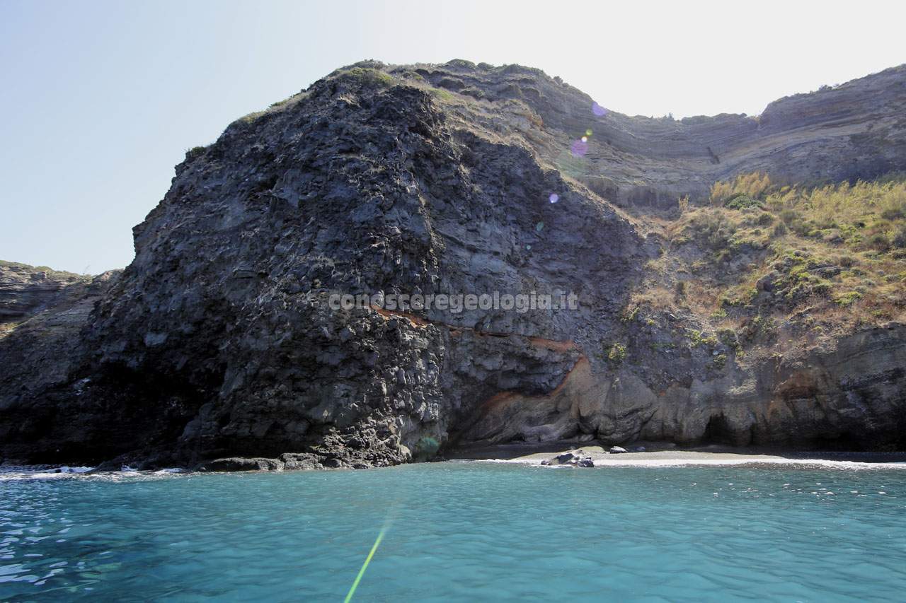 Figura n.6: La parte inferiore dell’isola di Ventotene, costituita prevalentemente da colate laviche (di colore nero) e la parte superiore da prodotti derivanti da eruzioni esplosive (Località Cala Parata Grande)