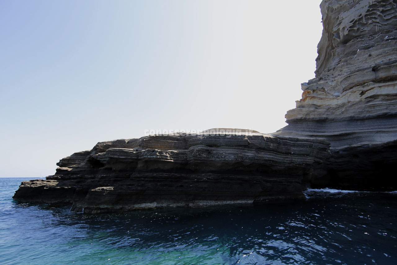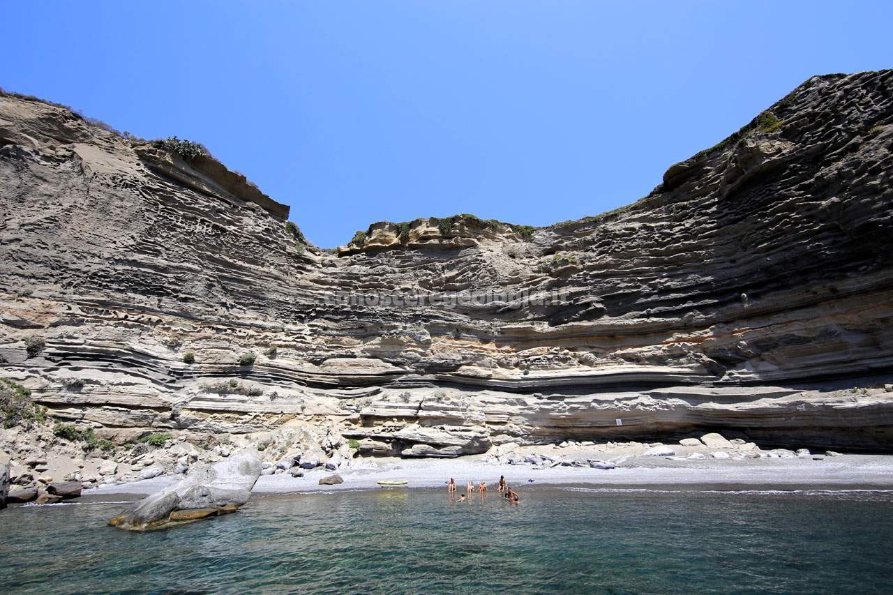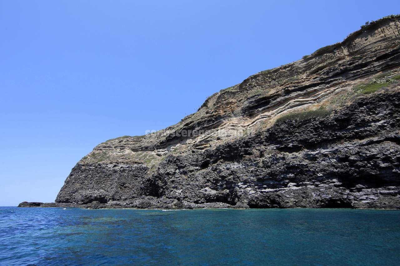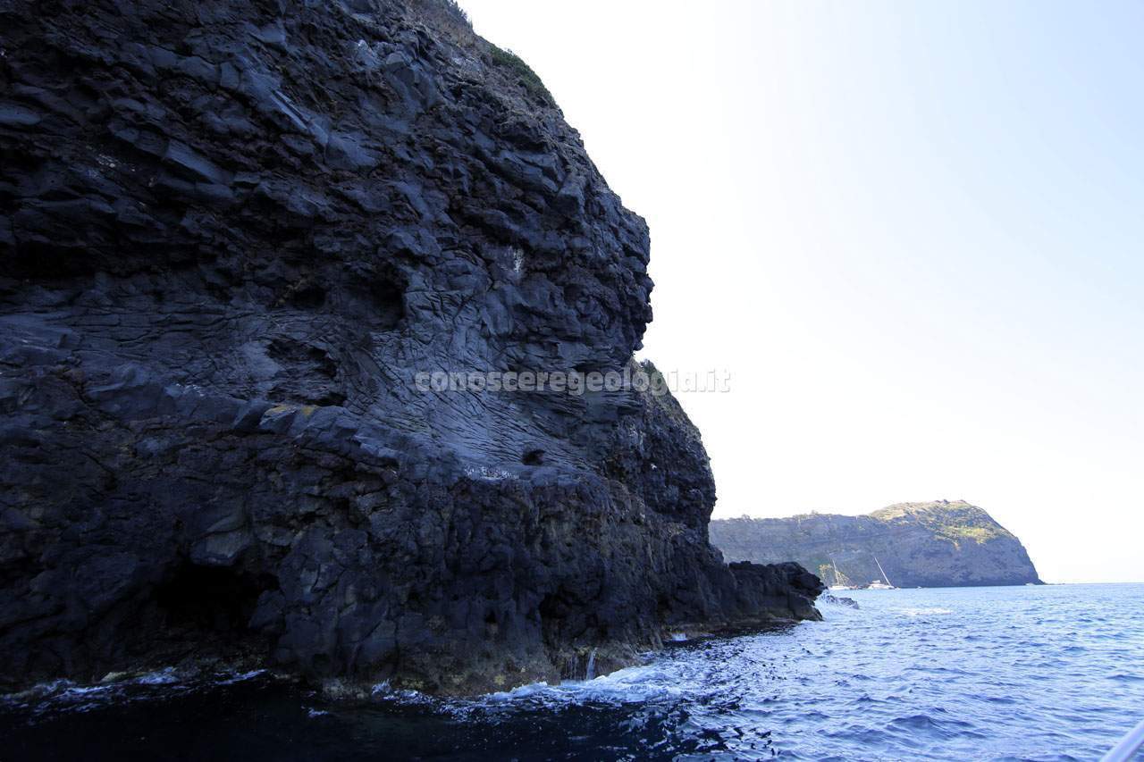 Figura n.6: La parte inferiore dell’isola di Ventotene, costituita prevalentemente da colate laviche (di colore nero) e la parte superiore da prodotti derivanti da eruzioni esplosive (Località Cala Parata Grande)