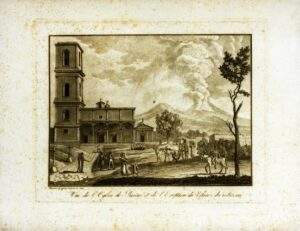 Figura 2 – Veduta della chiesa di Resina e dell’eruzione del Vesuvio del 23 ottobre 1822. Acquatinta, Certosa di San Martino, Soprintendenza Speciale per il Patrimonio Storico Artistico ed Etnoantropologico e per il Polo Museale della città di Napoli (ICCD n. 00321668 ).