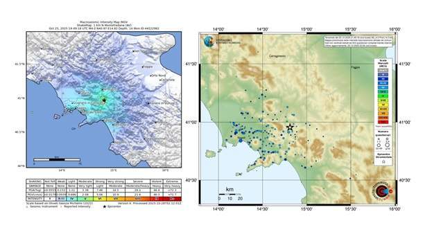secondo i dati accelerometrici delle reti INGV e DPC, l’evento del 25 ottobre (Mw 4.0) ha fatto registrare dei livelli di scuotimento stimato fino al V grado MCS nelle aree più prossime all’epicentro.